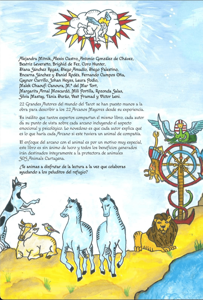 Siamo una grande famiglia impiantata in tutto il mondo: — Germania: @OraculosdeAssisAle — Argentina: @OraculosdeAssisArg — Brasile: @OraculosdeAssisBr — Cile: @OraculosdeAssisChile — Colombia: @OraculosdeAssisCol. — Spagna: @OraculosdeAssisEsp — Messico: @OraculosdeAssisMx — Uruguay: @OraculosdeAssisUy L'obiettivo primario della rete è quello di poter aiutare quanti più animali è possibile. Ho avuto l'onore di essere invitato da Tânia quello stesso autunno, a partecipare con una poesia al libro: “Oráculos de Assis: Passeando nos Arcanos Majores do Tarot”, che consiste in una raccolta di poesie dedicate agli Arcani Maggiori dei tarocchi , il cui obiettivo attraverso le vendite è collaborare con i rifugi per animali in Brasil. Dopo qualche mese ho trovato le risposte alle domande che avevo messo da parte. Il progetto del libro doveva essere senza dubbio collaborativo, senza scopo di lucro, con un fine nobile che prevede la costruzione di un mondo migliore. Una delle condizioni per poter filtrare e selezionare i partecipanti è essere almeno l'autore di un libro legato al meraviglioso mondo dei Tarocchi. Mi sento orgoglioso di aver realizzato questo sogno riunendo autori provenienti da diverse parti del mondo, e allo stesso tempo fortunato perché hanno accettato di fare volontariato contribuendo con la loro parte a una giusta causa. In questo caso, oltre a diffondere eticamente l'arte dei Tarocchi, si tratta di aiutare gli animali, sottolineando che il ricavato del libro andrà interamente a SOS Animals Cartagena. Quindi, uno ad uno ringrazio i collaboratori che sono amici e compagni di viaggio: Alejandra Mitnik, Alexis Castro, Antonio González de Chávez, Beatriz Leveratto, Brighid de Fez, Coro Hunter, Diana Sánchez Regas, Diego Amadío, Diego Palestino, Encarna Sánchez y Daniel Rodés, Fernando Campos Oña, Gaynor Carrillo, Johan Heyss, Laura Podio, M.ª del Mar Tort, Margarita Arnal Moscardó, Marta Campos Massó, Mehdi Fazzat, Mili Portilla, Rozonda Salas, Silvia Fornós Nivera, Tânia Durão, Veet Pramad y Víctor Leni Cordero.
