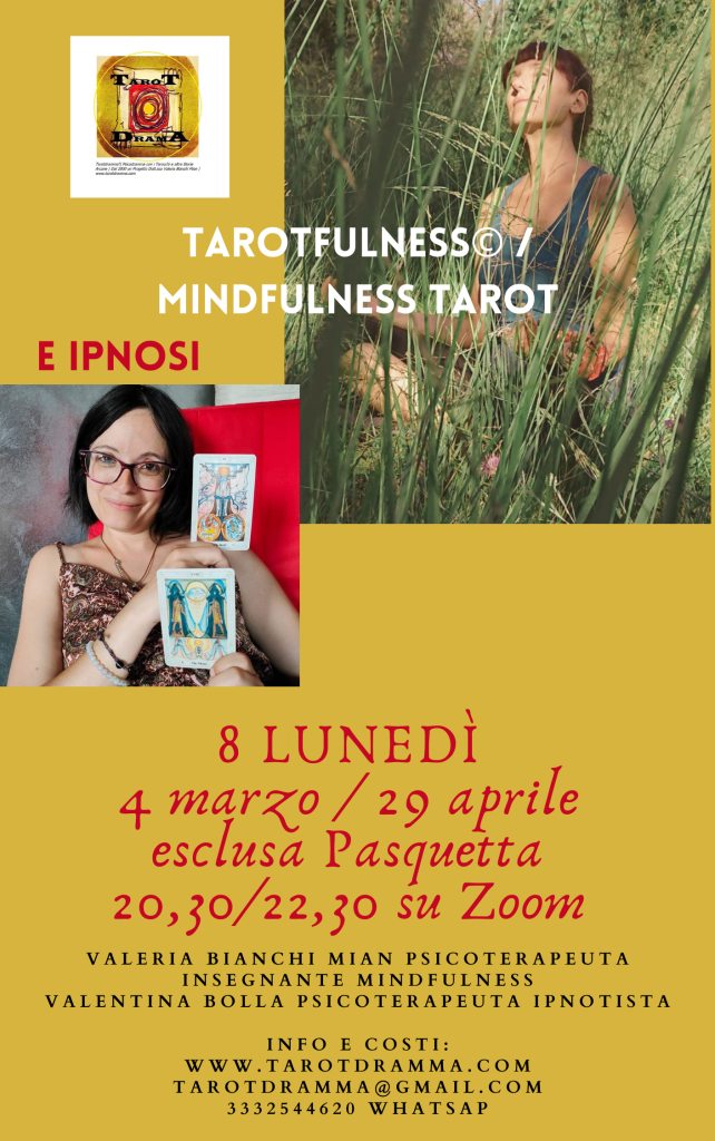 Se volete saperne di più, contattatemi perché da marzo, se vi interessa, ci sarà un nuovo corso dedicato a questo argomento, in collaborazione con la collega Dott.ssa Bolla che tratterà invece l’ipnosi con il Tarot. Il viaggio che abbiamo compiuto nel 2022 con la Tarotfulness© è stato meraviglioso! Con calma sto preparando il libro, abbiate fede. Per informazioni relative al corso che partirà a marzo e avrà luogo ogni lunedì sera su Zoom: tarotdramma@gmail.com