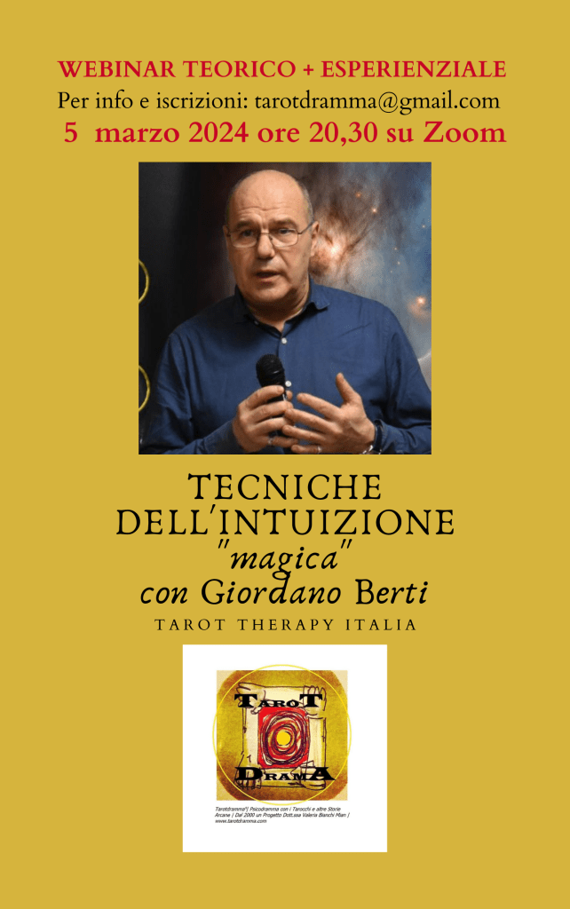 Il noto storico dell’esoterismo nell’arte, scrittore e curatore di importanti mostre internazionali Giordano Berti è tra i docenti esterni del Metodo Tarotdramma: Tarot Therapy Italia! Lezione specialissima. Possono partecipare anche coloro che non hanno frequentato il Corso Base. Per informazioni e iscrizioni scrivere alla mail: tarotdramma@gmail.com.