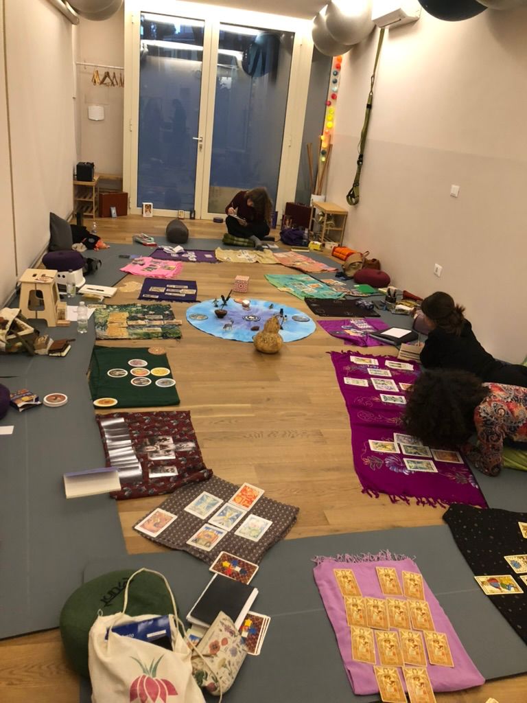 Dopo aver condotto due incontri ci sentiamo in un gruppo di Maghe-Papesse che, come un grande utero creativo, dà luogo a uno spazio di libera espressione di sé, ove si possono mettere a fuoco tanto le proprie difficoltà e i conflitti interiori, quanto i propri desideri e bisogni sentendoli sostenuti e legittimati dall’accoglienza del gruppo. C’è un grande e crescente bisogno di strumenti non mediati dalla mente razionale e non performativi. Gli strumenti immaginativi, immersivi e creativi del Metodo Tarotdramma® soddisfano questo bisogno consentendo la creazione di un clima ludico e leggero mentre si affrontano temi intimi e complessi.
