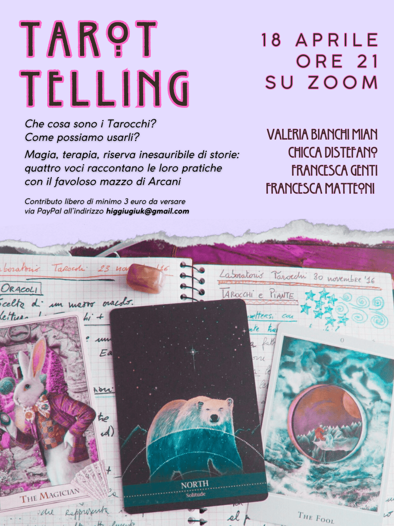 I miei corsi e laboratori hanno preso vita a partire dal 2000. TAROTDRAMMA® è il nome che meglio rappresenta questo incontro tra mondi apparentemente distanti, spazio-tempo che mi vede all’opera con gli strumenti del Tarot Telling – esperienze di narrazione corale, individuale, percorsi poetici con le carte – e con un nuovo modello, il Tarotdramma, nato a partire dallo Psicodramma e dal Sociodramma con gli arcani maggiori e minori. Il modello è una Stella che comprende: Tarot Art, Tarot Poetry, Tarotfulness© (la Mindfulness con il Tarot), Tarot Telling e collaborazioni che creano nuove idee. I corsi e i laboratori si rivolgono agli adulti e anche ai bambini.