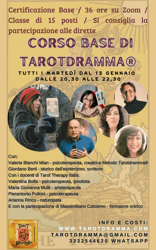I miei corsi e laboratori hanno preso vita a partire dal 2000. TAROTDRAMMA® è il nome che meglio rappresenta questo incontro tra mondi apparentemente distanti, spazio-tempo che mi vede all’opera con gli strumenti del Tarot Telling – esperienze di narrazione corale, individuale, percorsi poetici con le carte – e con un nuovo modello, il Tarotdramma, nato a partire dallo Psicodramma e dal Sociodramma con gli Arcani Maggiori e Minori. Il modello è una Stella che conduce al Metarcano©, la carta che ti corrisponde in anima.